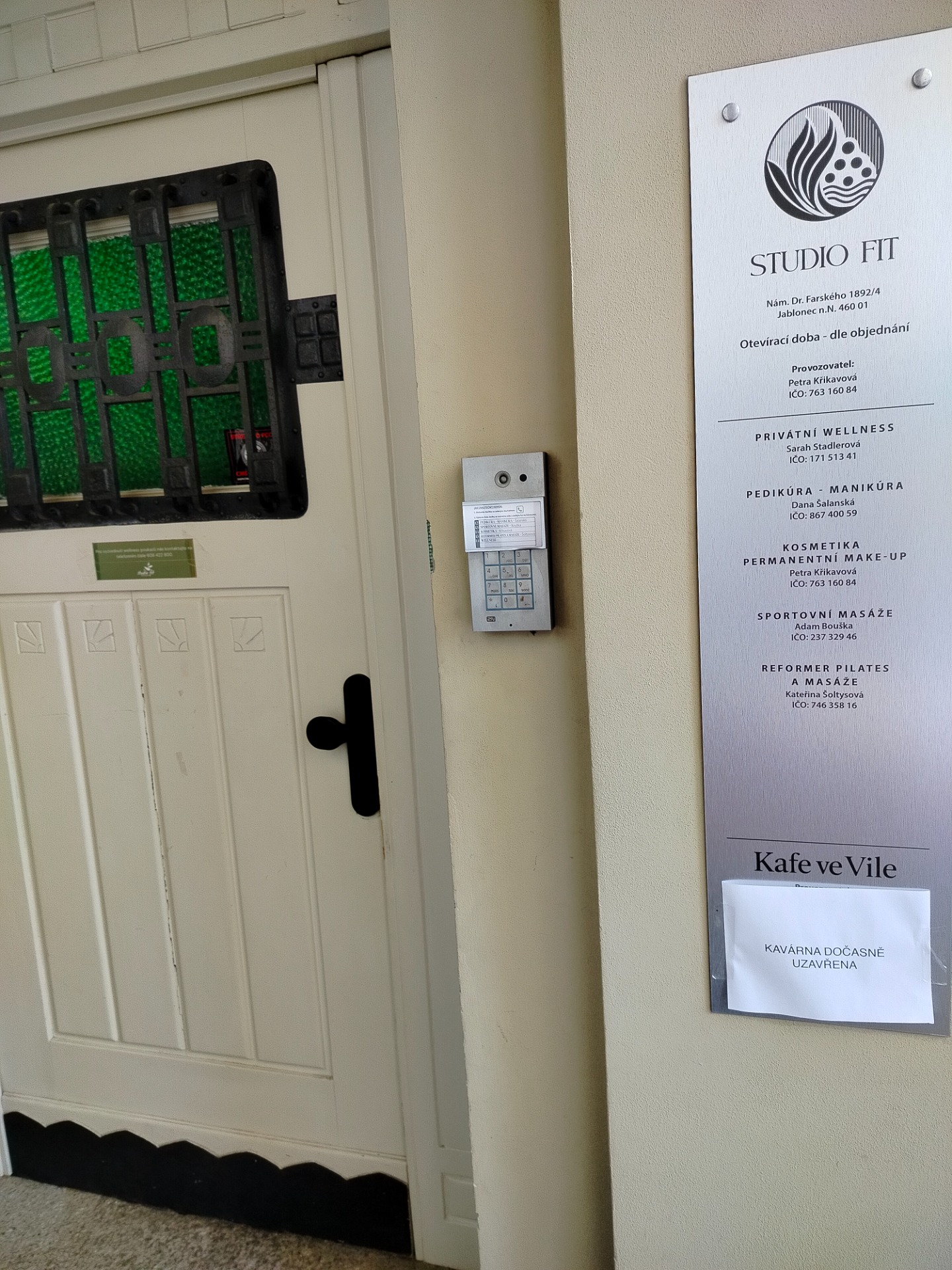 Pracovna se nachází ve 2. p. domu bez výtahu - vila mezi kostelem a domem skla, sídlí zde Studio Fit. Zatím nemám u vchodu, ani na zvonku žádné označení. Při vstupu stačí zmáčknout zelené sluchátko a číslo 11. Pokud by se dveře neotevřely, volejte prosím, přijdu vám otevřít. Po vstupu pokračujte přes prosklené dveře, dozadu kolem barového pultu a po schodech nahoru až do podkroví. Tam prosím počkejte, přijdu pro vás. Příchod je možný nejdříve 5 min před začátkem vaší konzultace, děkuji.